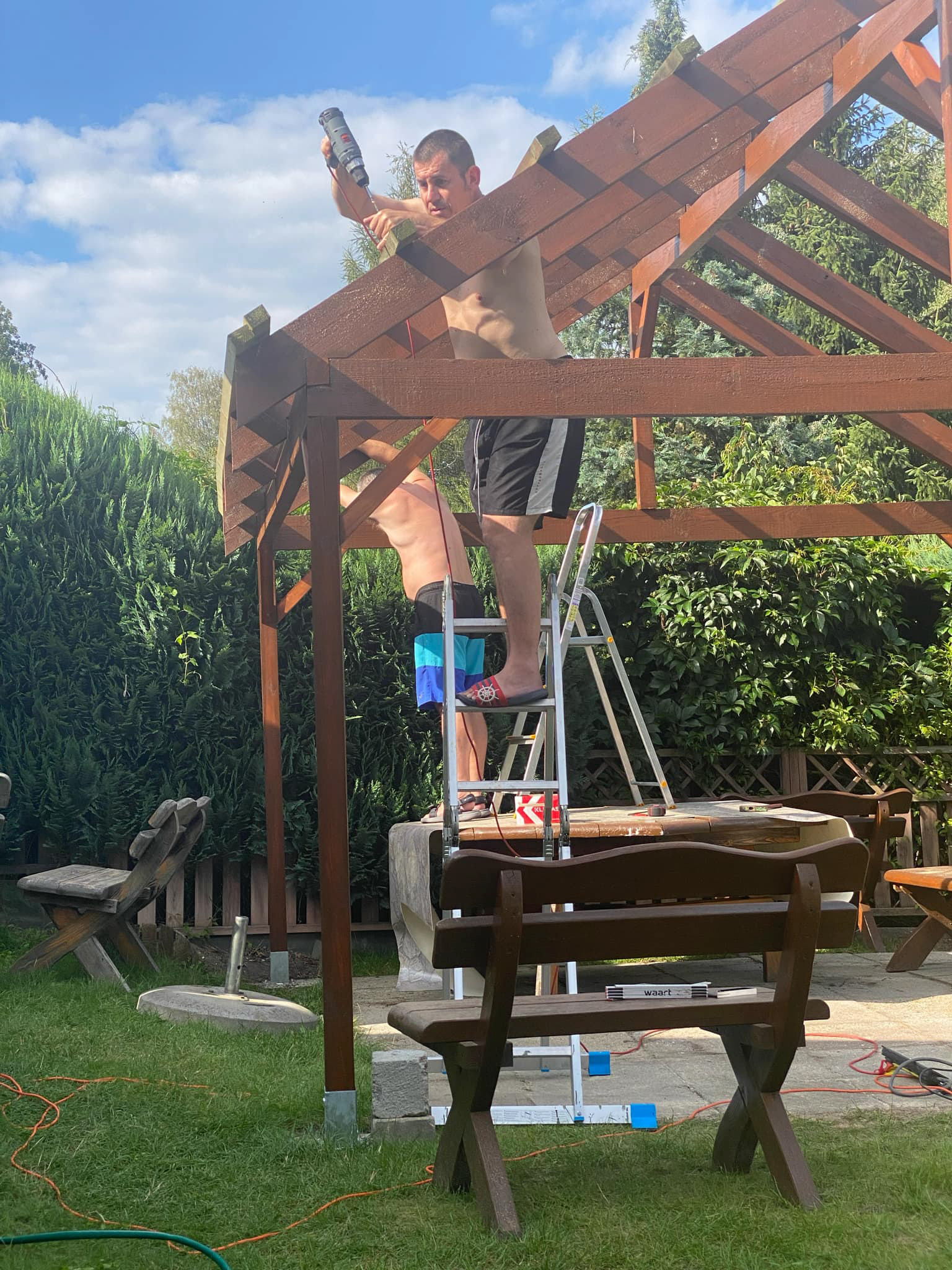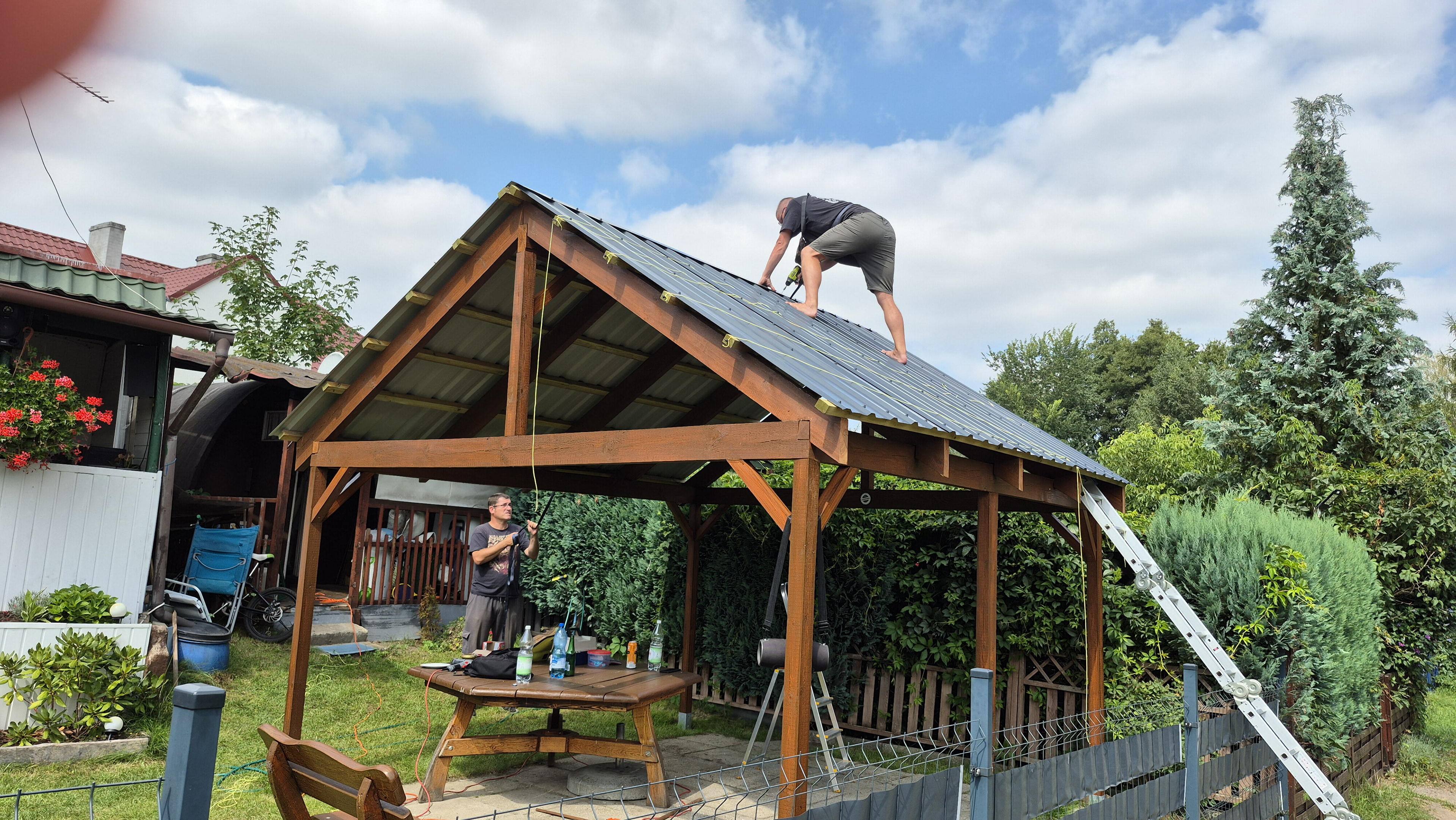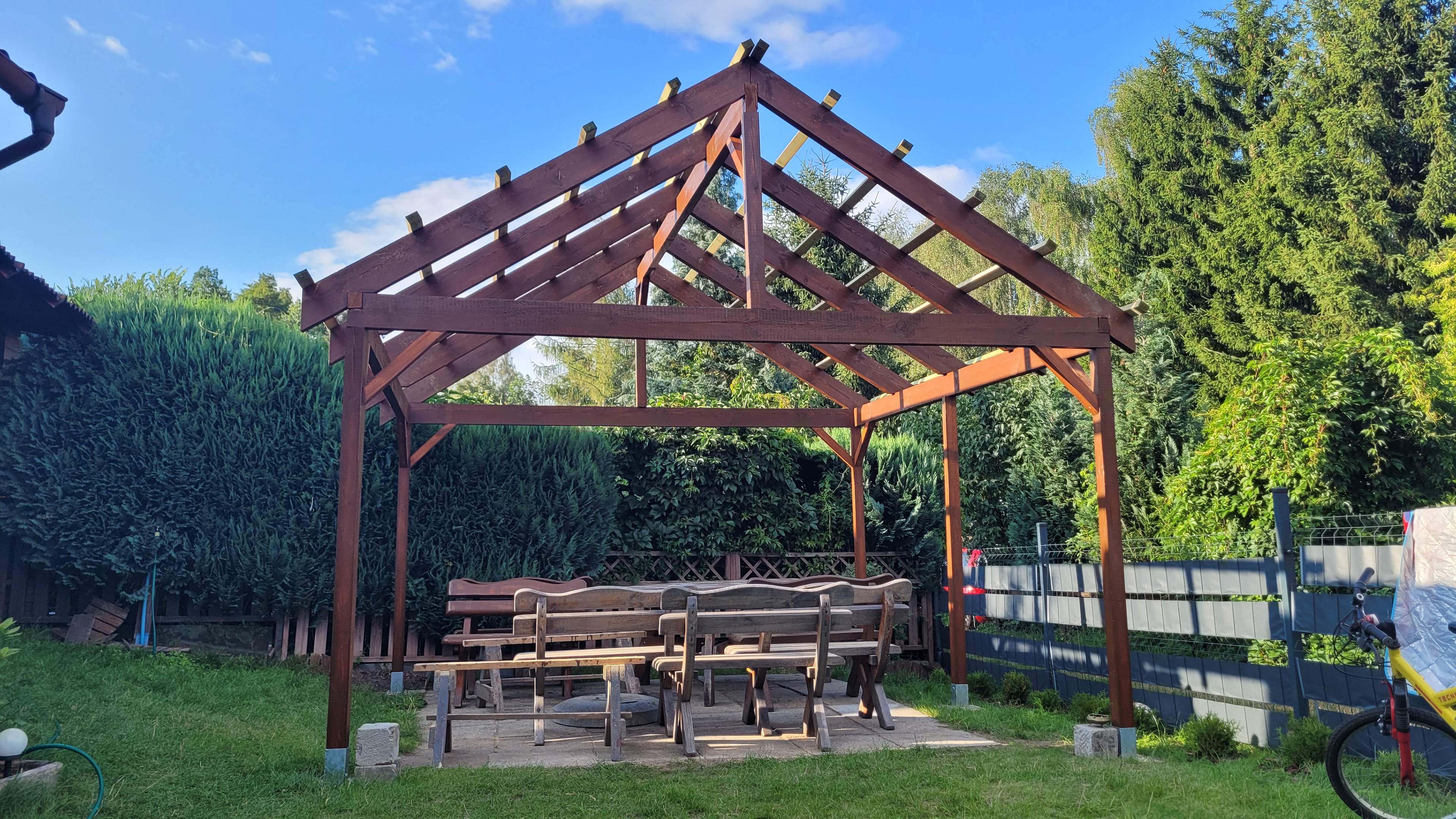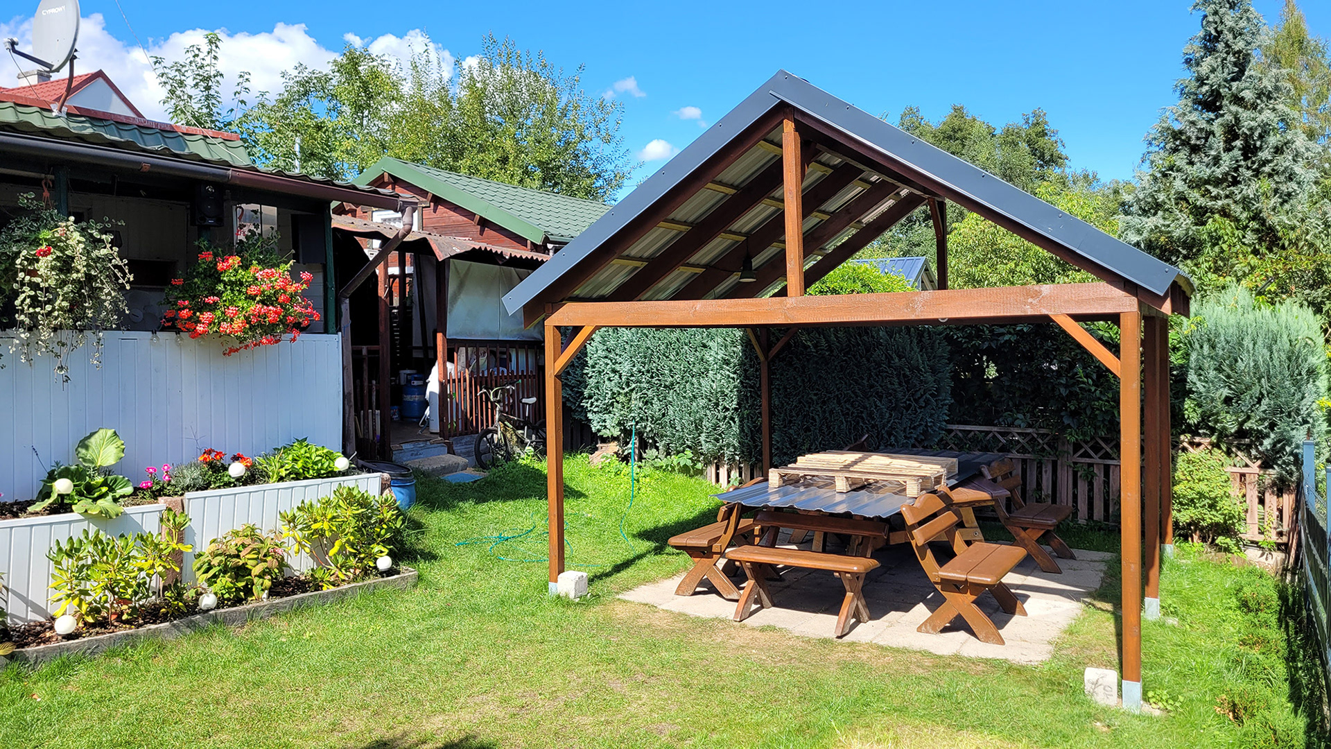 Projekt obejmował wykonanie solidnej konstrukcji drewnianej nad stołem i ławami, tworząc przytulne miejsce do spotkań na świeżym powietrzu. Do budowy wykorzystaliśmy drewno konstrukcyjne, które zapewnia stabilność i estetyczny wygląd, a całość zwieńczyliśmy blachodachówką trapezową – trwałą i odporną na warunki atmosferyczne. Dzięki temu zadaszenie chroni przed deszczem i słońcem, a jednocześnie harmonijnie wpisuje się w otoczenie ogrodu.