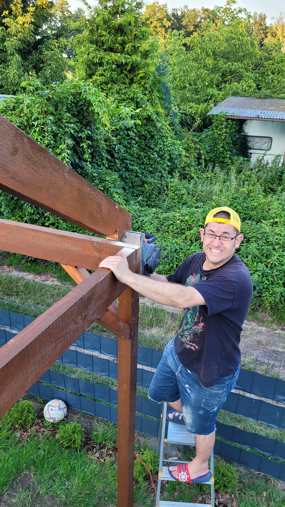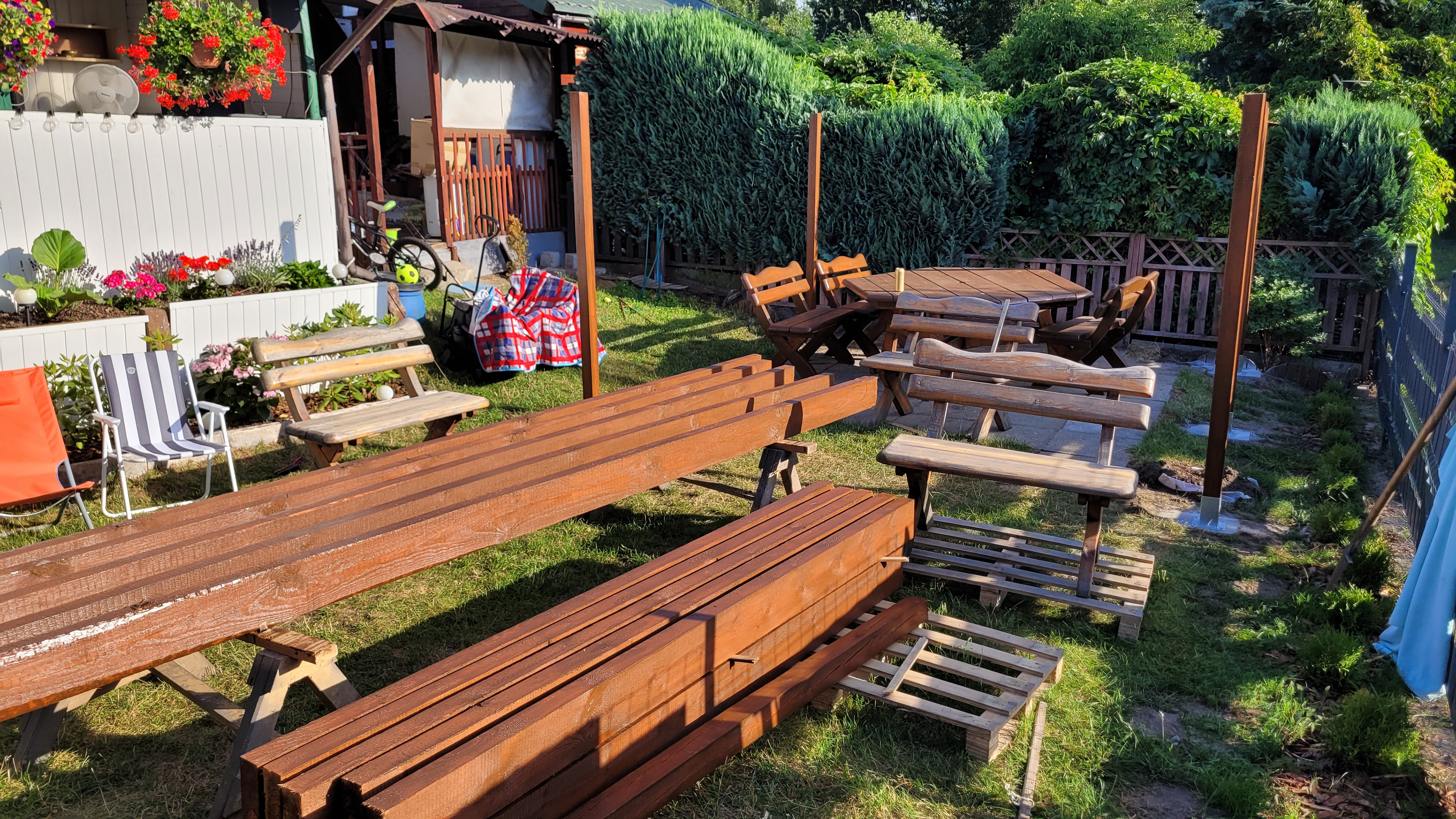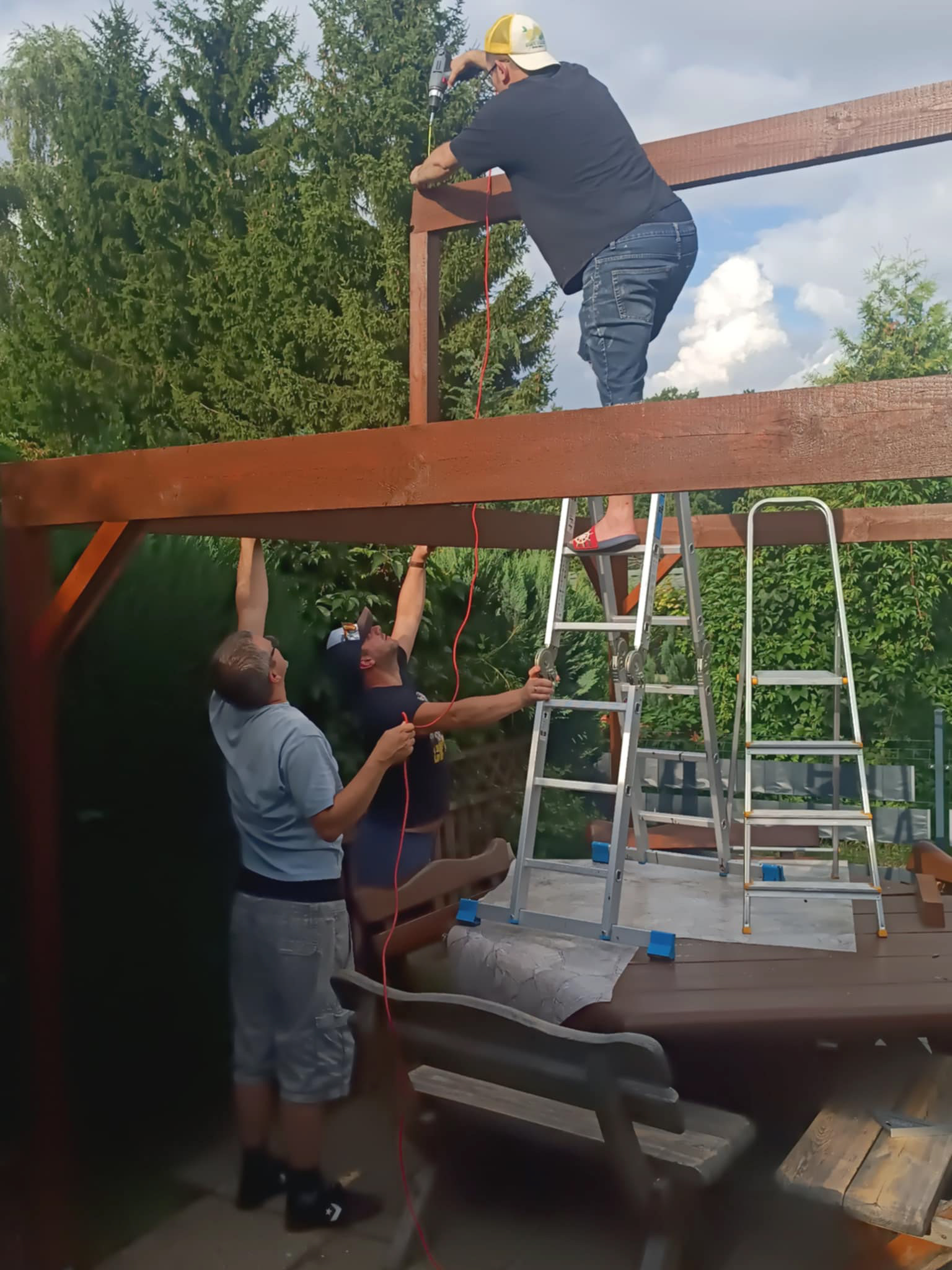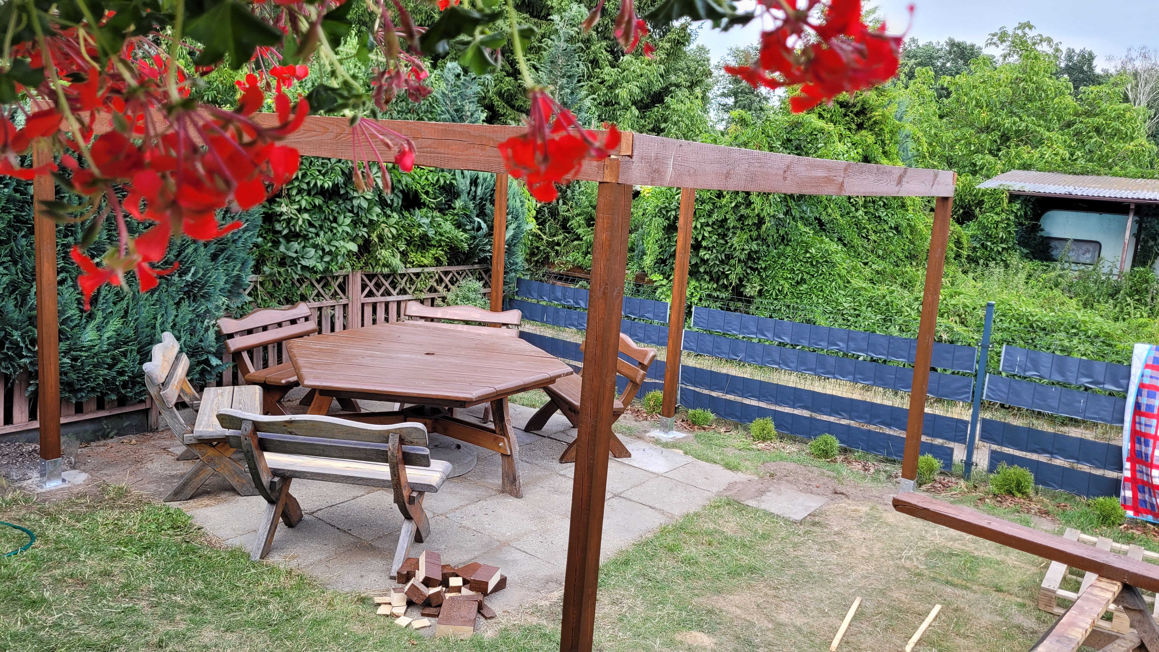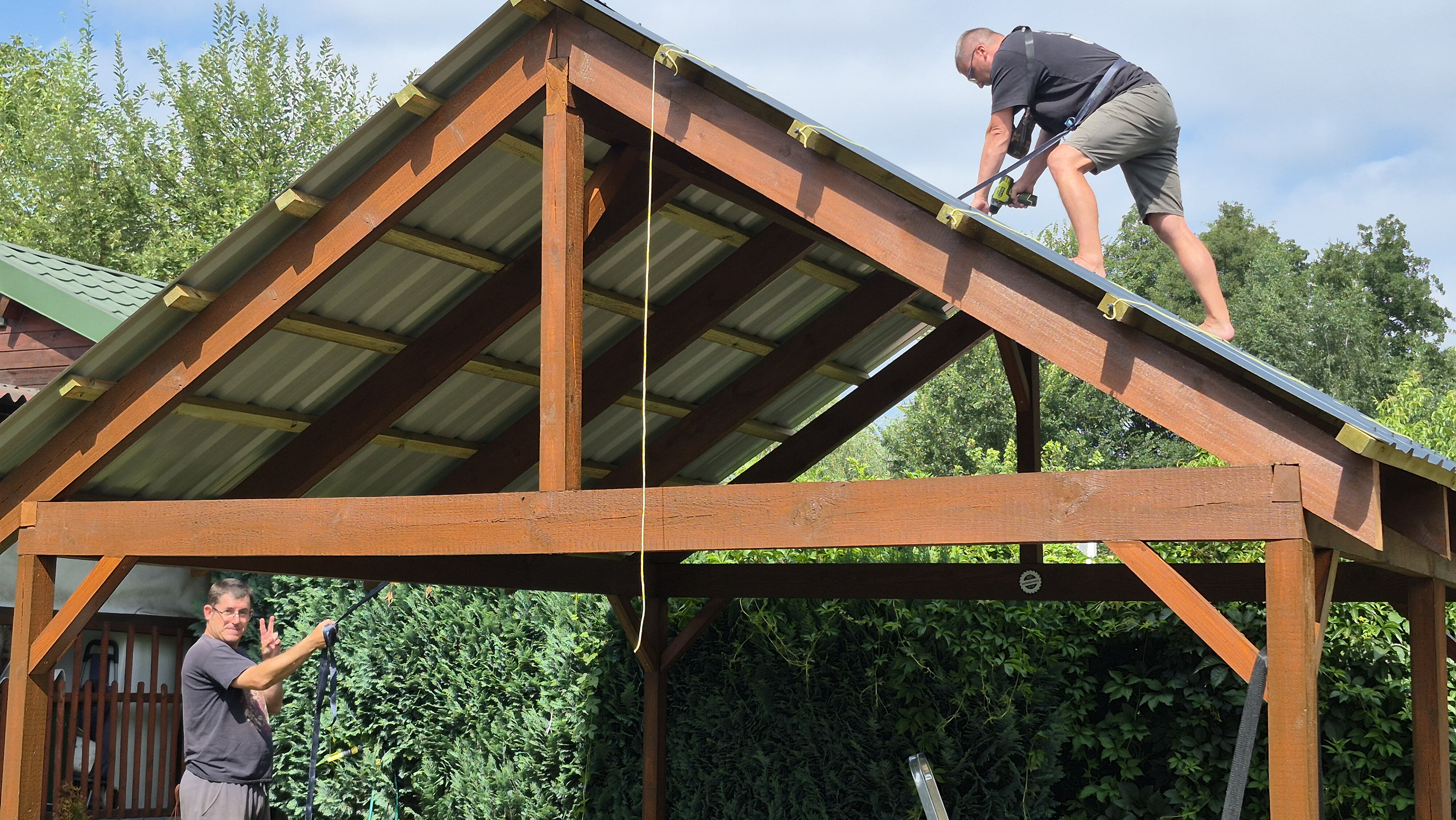 Projekt obejmował wykonanie solidnej konstrukcji drewnianej nad stołem i ławami, tworząc przytulne miejsce do spotkań na świeżym powietrzu. Do budowy wykorzystaliśmy drewno konstrukcyjne, które zapewnia stabilność i estetyczny wygląd, a całość zwieńczyliśmy blachodachówką trapezową – trwałą i odporną na warunki atmosferyczne. Dzięki temu zadaszenie chroni przed deszczem i słońcem, a jednocześnie harmonijnie wpisuje się w otoczenie ogrodu.