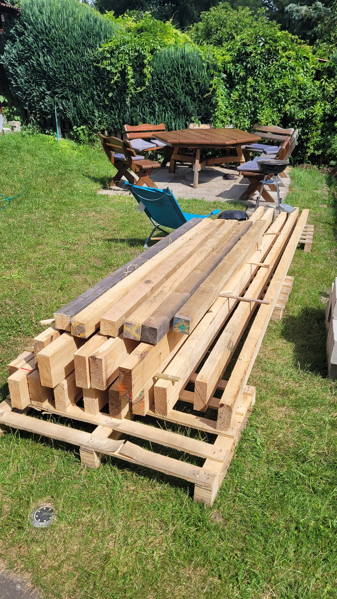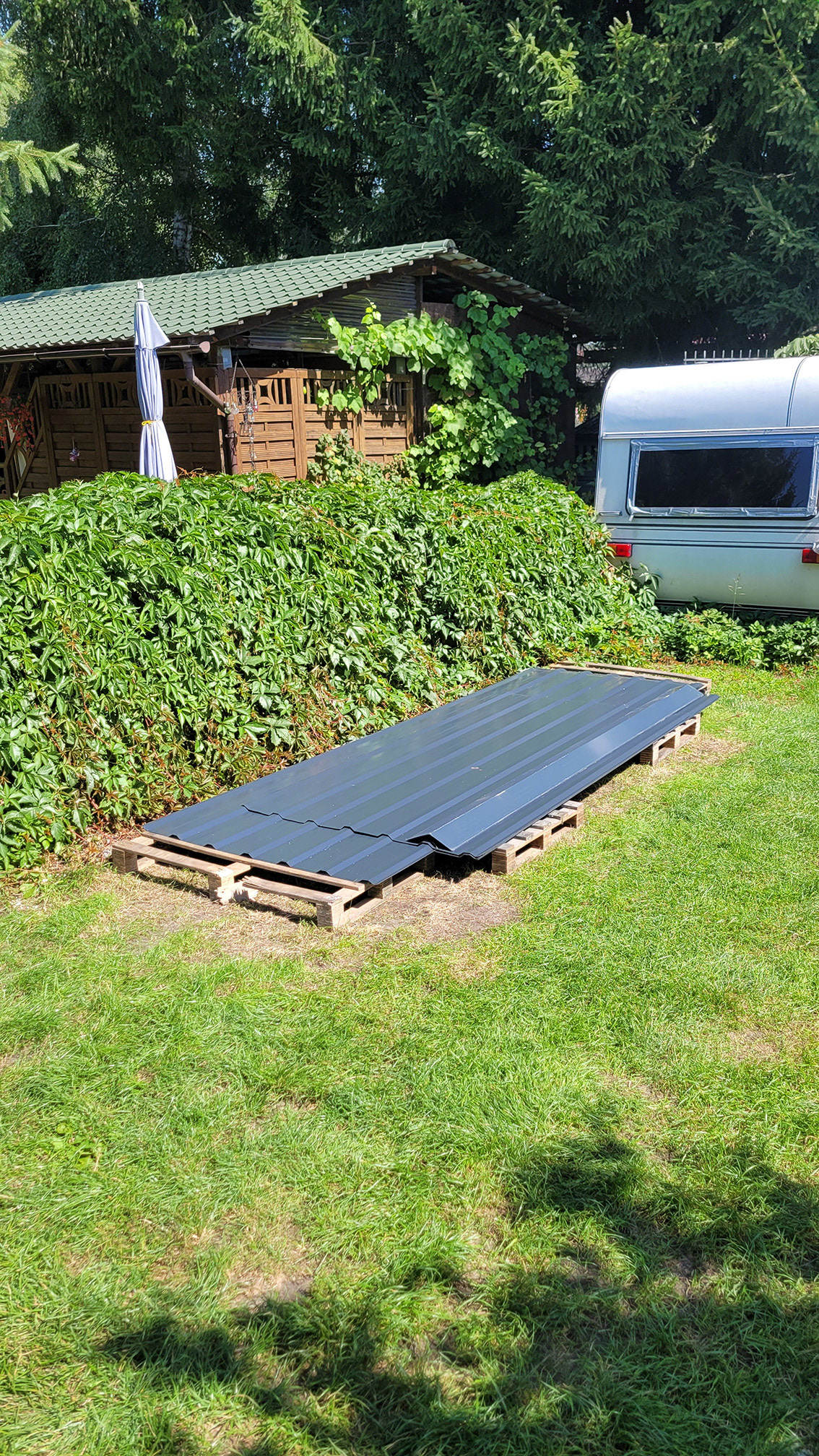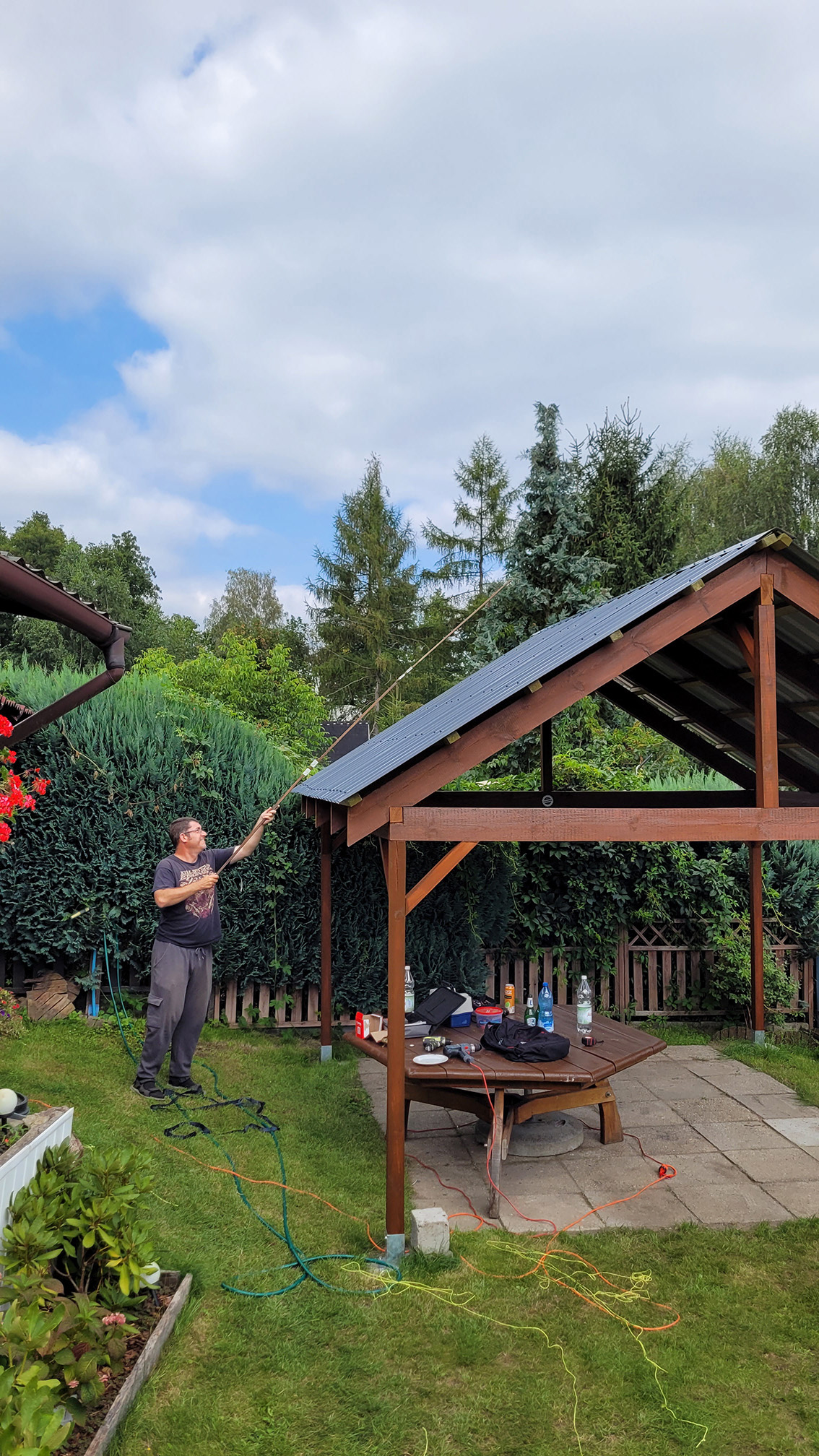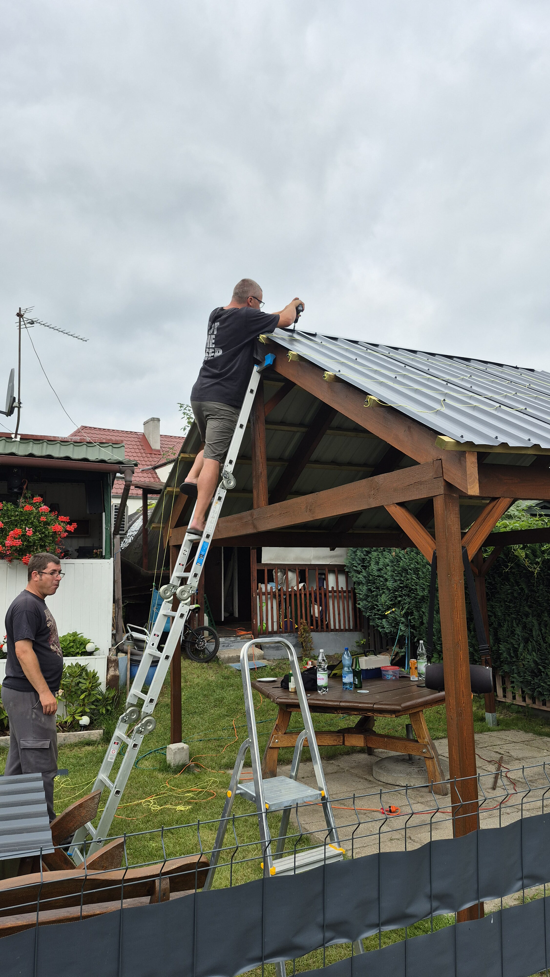 Projekt obejmował wykonanie solidnej konstrukcji drewnianej nad stołem i ławami, tworząc przytulne miejsce do spotkań na świeżym powietrzu. Do budowy wykorzystaliśmy drewno konstrukcyjne, które zapewnia stabilność i estetyczny wygląd, a całość zwieńczyliśmy blachodachówką trapezową – trwałą i odporną na warunki atmosferyczne. Dzięki temu zadaszenie chroni przed deszczem i słońcem, a jednocześnie harmonijnie wpisuje się w otoczenie ogrodu.